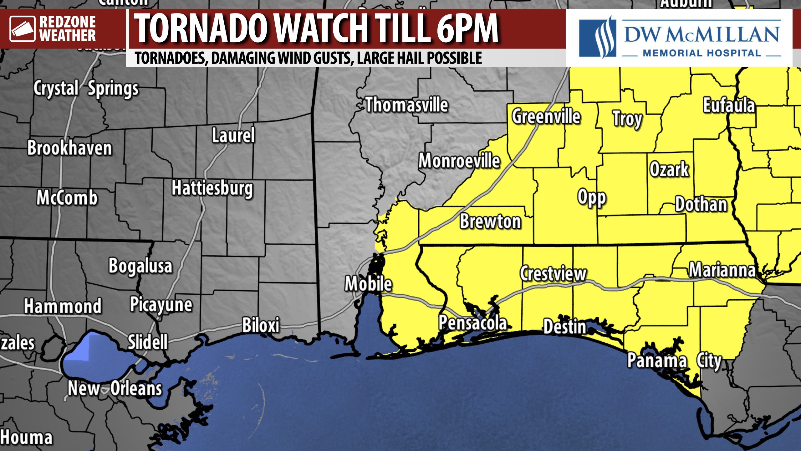 TORNADO WATCH IN EFFECT… Tornado Watch till 6PM for Baldwin, Escambia (AL), Conecuh, Butler, Covington, Escambia (FL), Santa Rosa, Okaloosa counties and points east in SE AL and the Florida Panhandle. This includes Daphne, Spanish Fort, Fairhope, Bay Minette, Foley, Sumemrdale, Gulf Shores, Orange Beach, Elberta, Gateswood, Seminole, Lillian, Pensacola, Century, Walnut Hill, McDavid, Warrington, Perdido Key, Bratt, Gonzalez, Cantonment, Brewton, Atmore, Flomaton, Poarch, Huxford, Appleton, Nokomis, Damascus, Evergreen, Lenox, Belleville, Owassa, Johnsonville, Castleberry, Greenville, Georgiana, McKenzie, Oaky Streak, Forest Home, Andalusia, Opp, Florala, Red Level, Straughn, Rose Hill, Milton, Pace, Jay, Chumuckla, Allentown, Navarre, Gulf Breeze, Midway (FL), Tiger Point, Holt, Harold, Baker, Milligan, Crestview, Destin, Niceville, Fort Walton Beach and points west in southeast Alabama, the Florida Panhandle, and into southwest Georgia.
