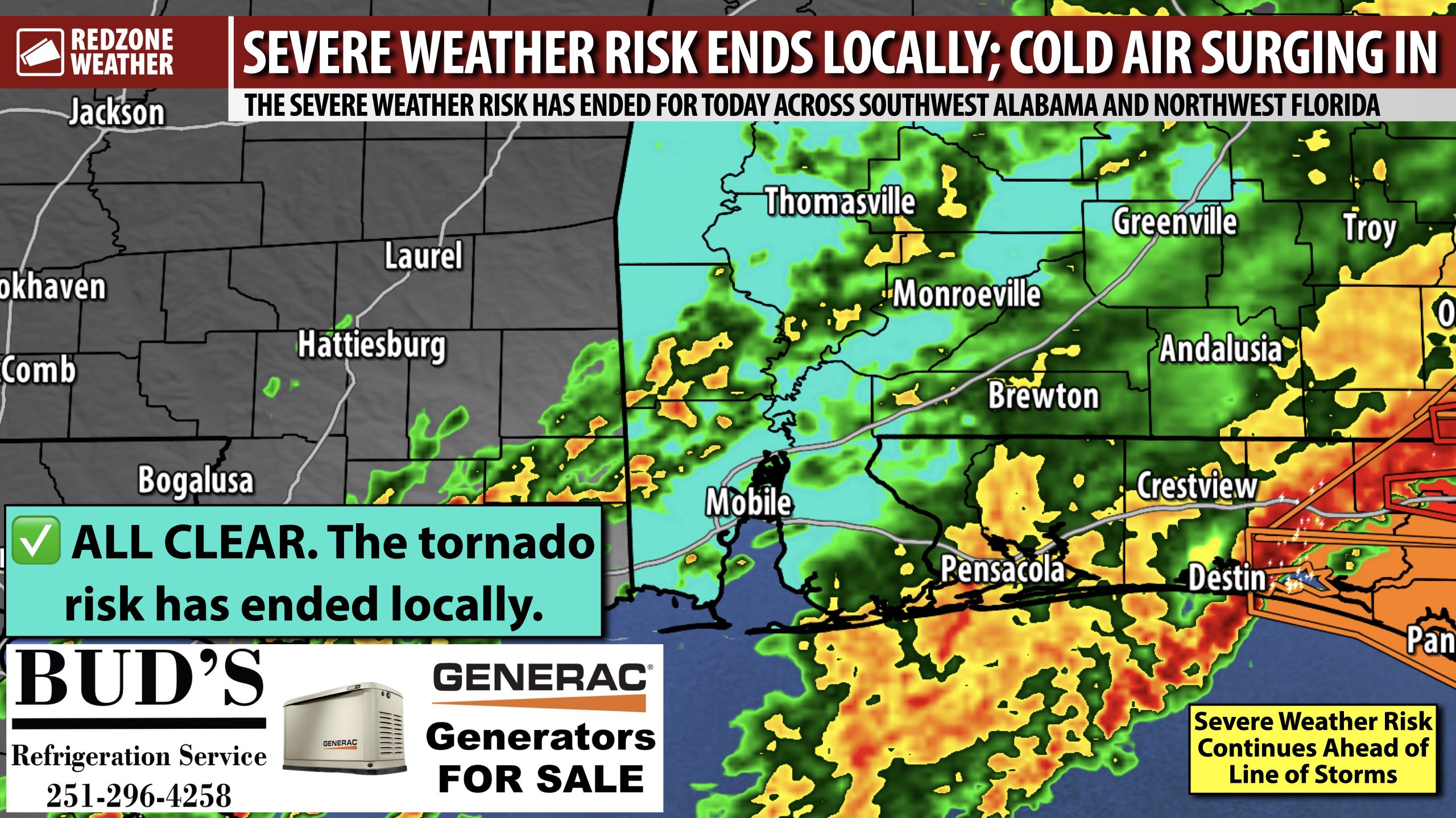ALL CLEAR FOR S.W. ALABAMA & N.W. FLORIDA; STORM DAMAGE REPORTED… The severe weather risk has officially ended for today (Sunday, January 25, 2026) across southwest Alabama and northwest Florida for areas west of Opp, Crestview, and Destin. Multiple severe thunderstorm warnings and tornado warnings continue as of 2PM across parts of southeast Alabama and the Florida Panhandle region to our east. Rain will continue at times over the next several hours but the risk of tornadoes has ended across our local area.