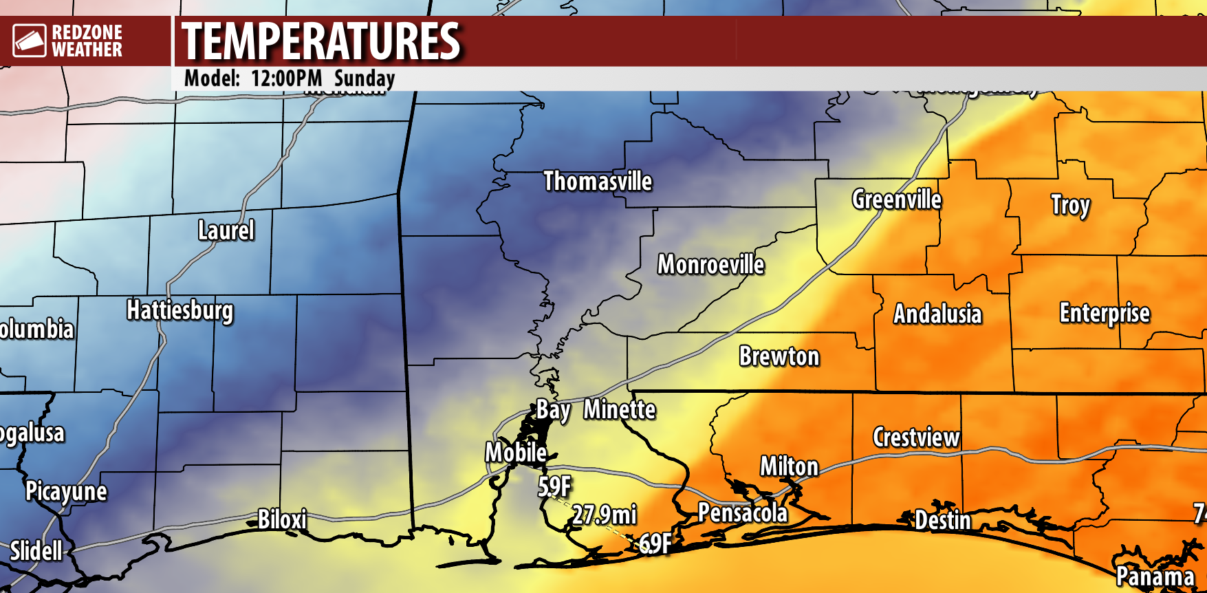 Another example is below showing temperatures near 69-70° at Orange Beach with temperatures behind the cold front in the upper 50s (59°) at Daphne. This map (below) is valid at Noon.