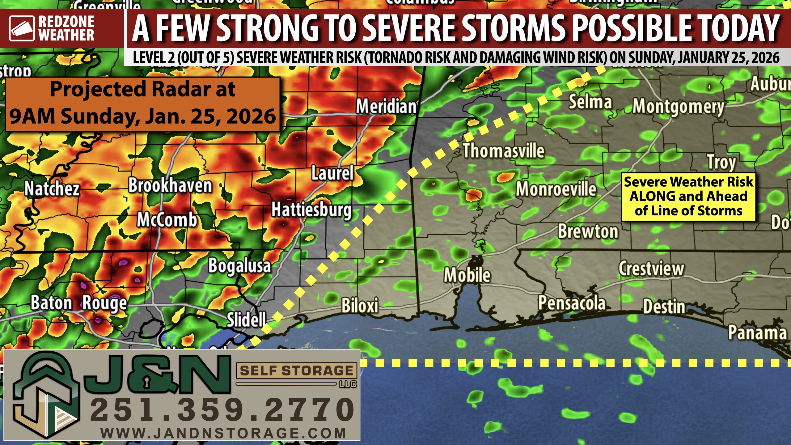 SEVERE WEATHER TIMING – TODAY… 9AM to 5PM is now the window for strong to severe storms across south Alabama and northwest Florida with the core window being from 11AM to 3PM. We encourage everyone to have multiple ways to hear warnings today, just in case a tornado warning is needed for your specific location.