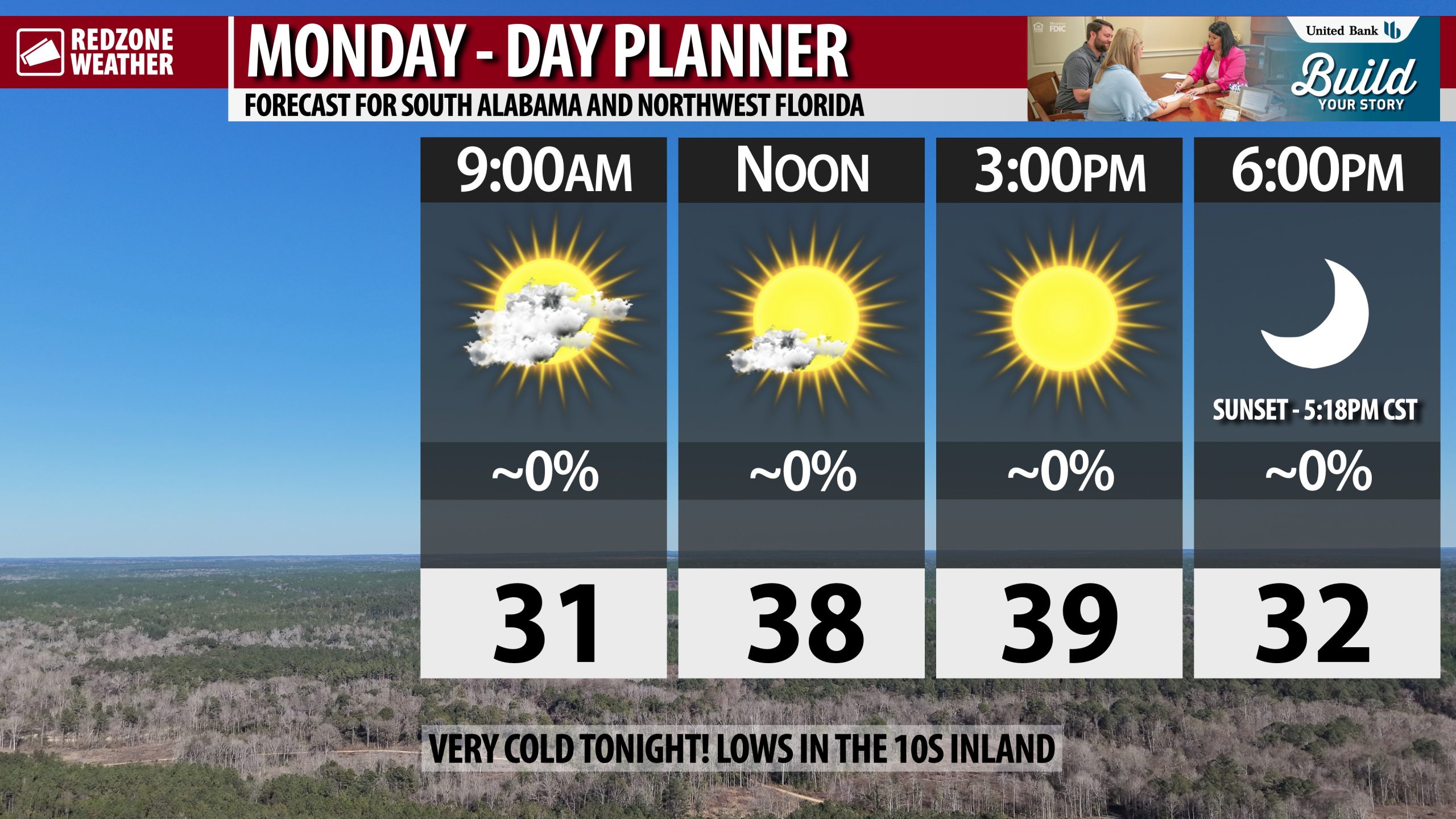QUITE COLD TODAY; HIGHS ONLY NEAR 40 DEGREES… Keep the heavy jackets close on this Monday. Most communities across south Alabama won’t get above the 40 degree mark this afternoon. Much of NW Florida will have high temperatures in the low 40s.