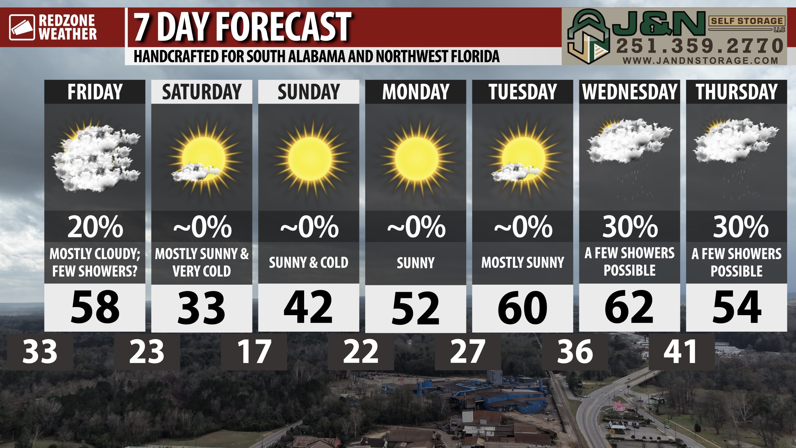 Posted inBlog 6:29AM January 30, 2026 Posted by spinks January 30, 2026No Comments VERY COLD THIS WEEKEND… The weather pattern this weekend will be QUITE cold across south Alabama and northwest Florida – just about as cold as it ever gets around here. Afternoon highs tomorrow won’t crack the freezing mark in some communities. Post navigation Previous Post 6:29AM January 30, 2026