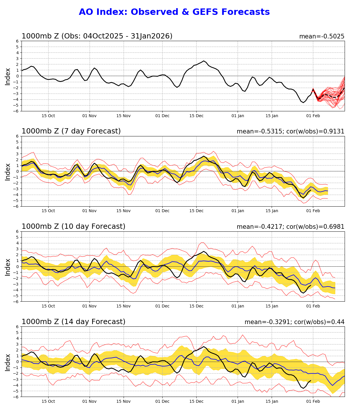The good news: The AO is expected to trend toward positive values (thus cold, Arctic air will be “locked up” in the Arctic) in a few weeks. Hopefully this will bring an end to the ridiculously, unseasonably cold we have had and will have in the days ahead.