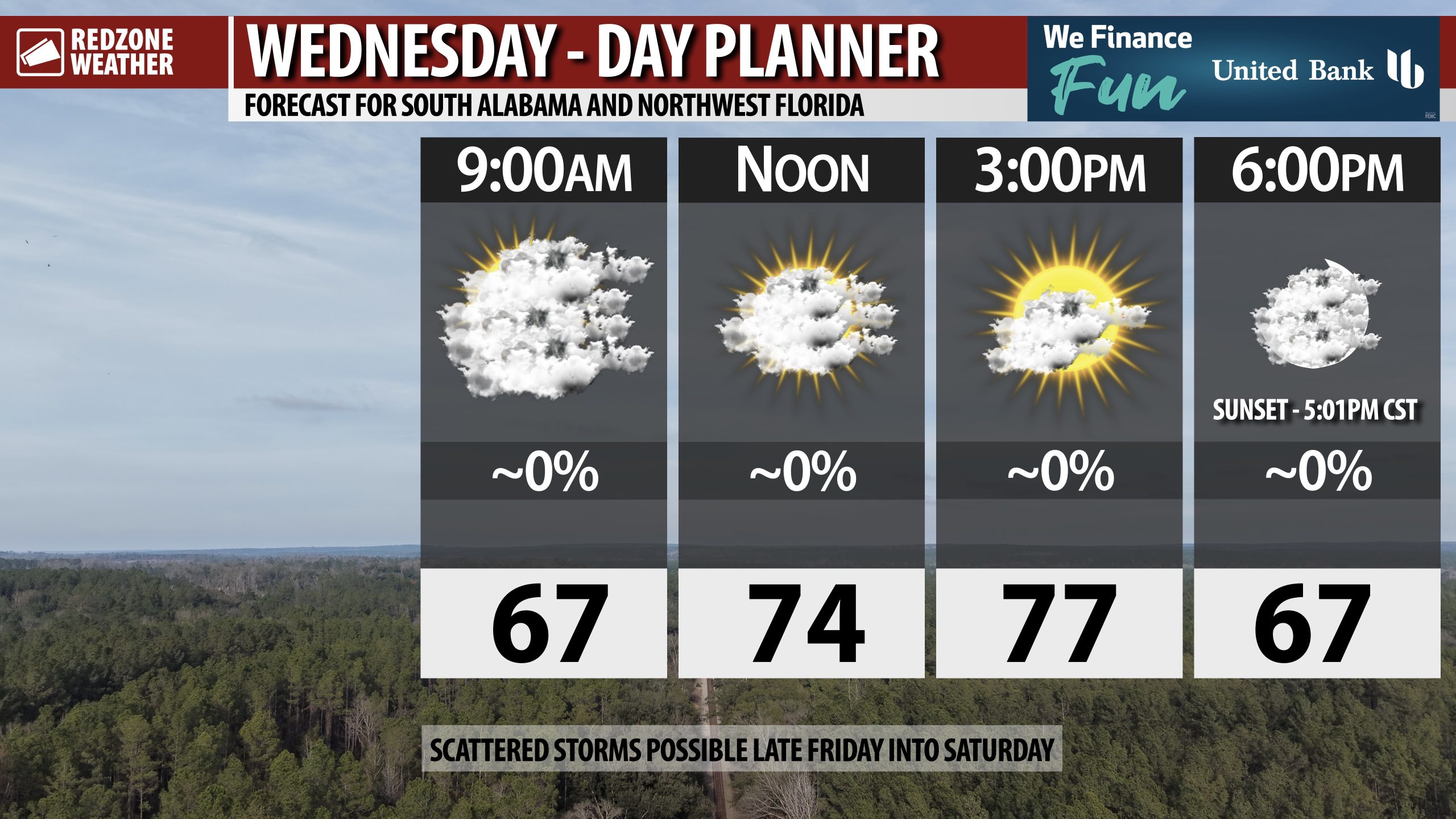 WARM TEMPS THIS AFTERNOON; SPOTTY STORMS RETURN LATE FRIDAY INTO SATURDAY… Pleasant weather is in store on this Wednesday with unseasonably warm temperatures for early January. Temperatures will peak in the mid to upper 70s across south Alabama and northwest Florida today. It will be a perfect afternoon to get out and do some yard work or go for a run. Sunset today happens at 5:01PM. Our next chance of rain sets up on Friday into Saturday as a cold front approaches. We may have a low-end risk of a few stronger storms, but the good news is the bulk of the severe storms will likely remain well to our north. Much colder air arrives on Sunday after the passage of the cold front.