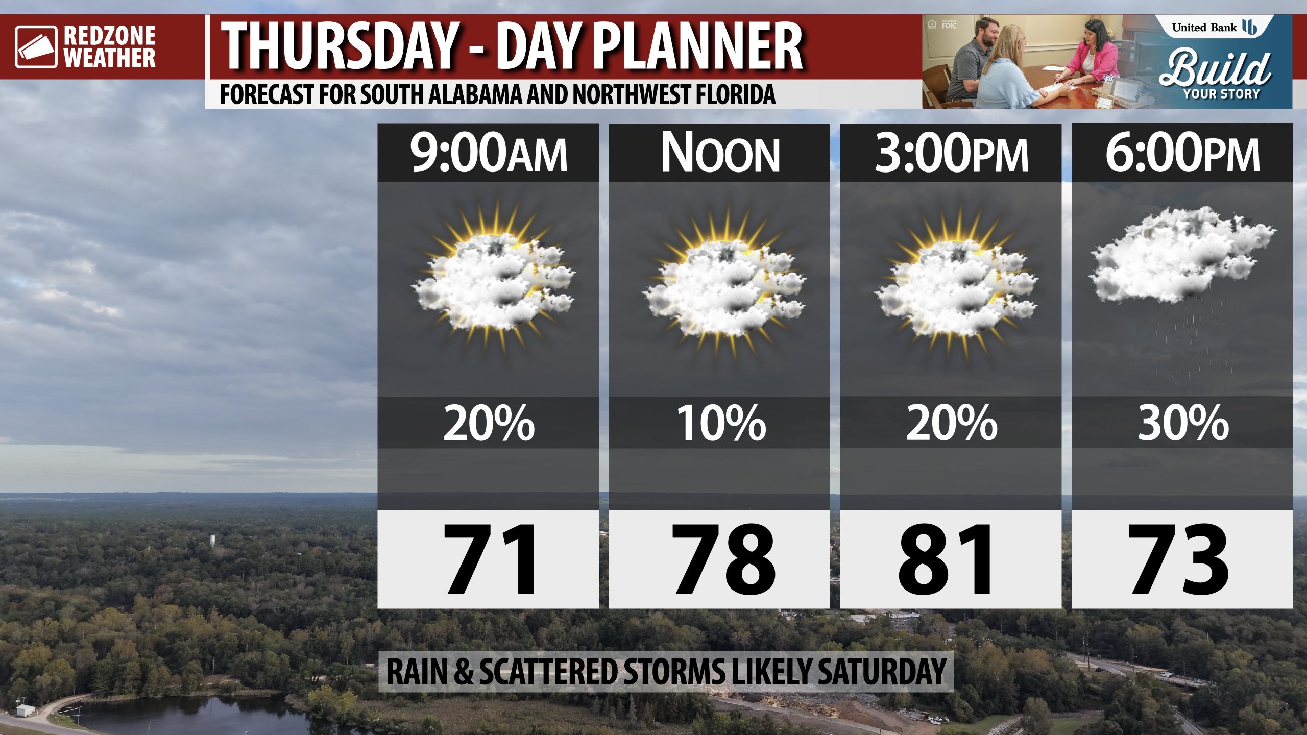 A FEW SHOWERS TODAY… Sprinkles and showers will be possible on this Thursday across south Alabama and northwest Florida. The rain amounts won’t amount to much at all. Cloudy skies will persist for much of the day.