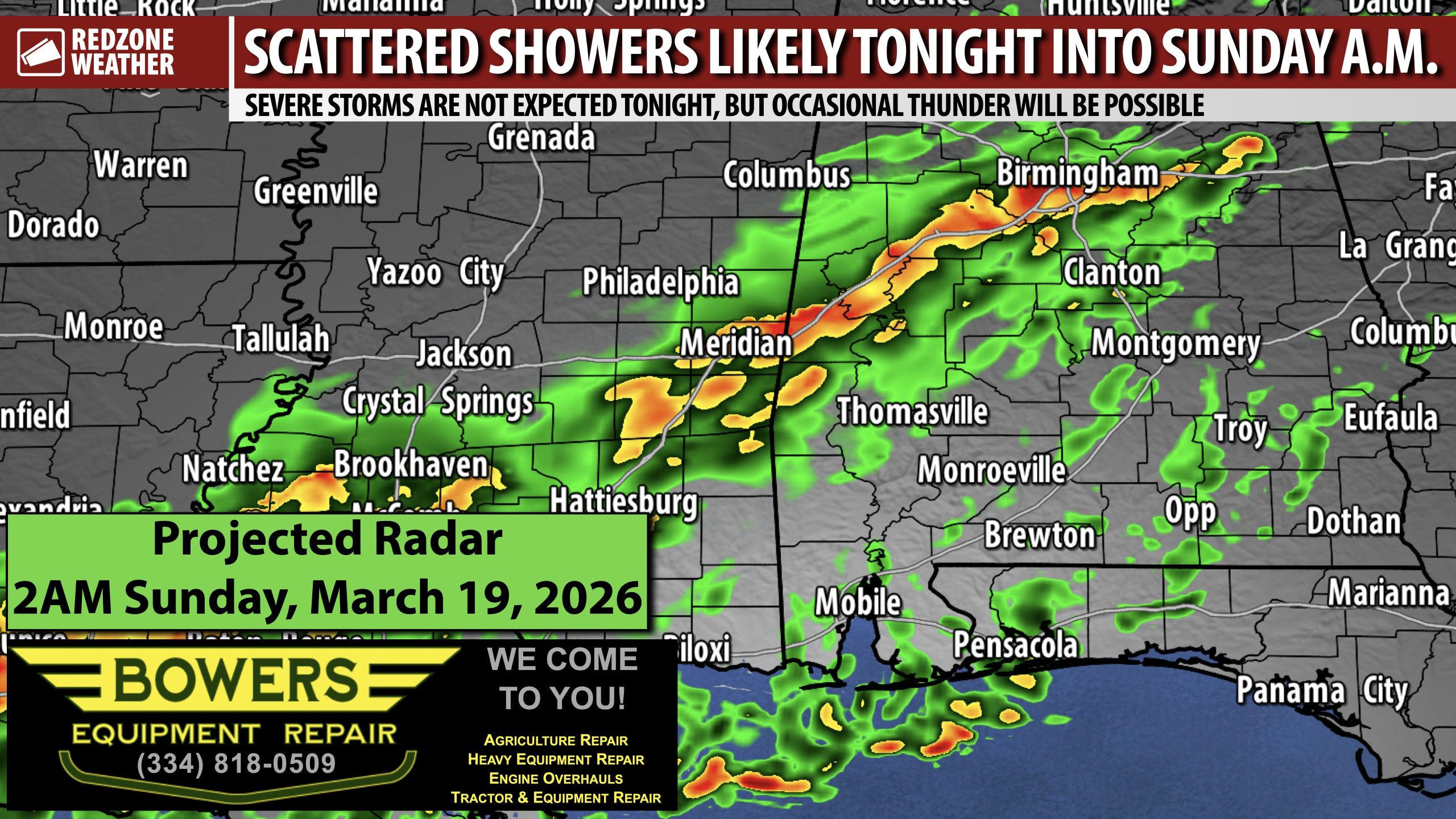 SPOTTY SHOWERS LOCALLY OVERNIGHT INTO SUNDAY… Let me lead off by saying that most communities will NOT get much rain off this event across south Alabama and northwest Florida. We’re talking rain totals of 0.1″ to 0.5″ being the norm. The greatest rain totals (0.4″ to 0.5″) will probably happen in parts of Clarke, Washington, Monroe, Wilcox, Marengo, and Choctaw counties in west Alabama. Widespread severe weather is not expected tonight or tomorrow, but a few rumbles of thunder cannot completely be ruled out.