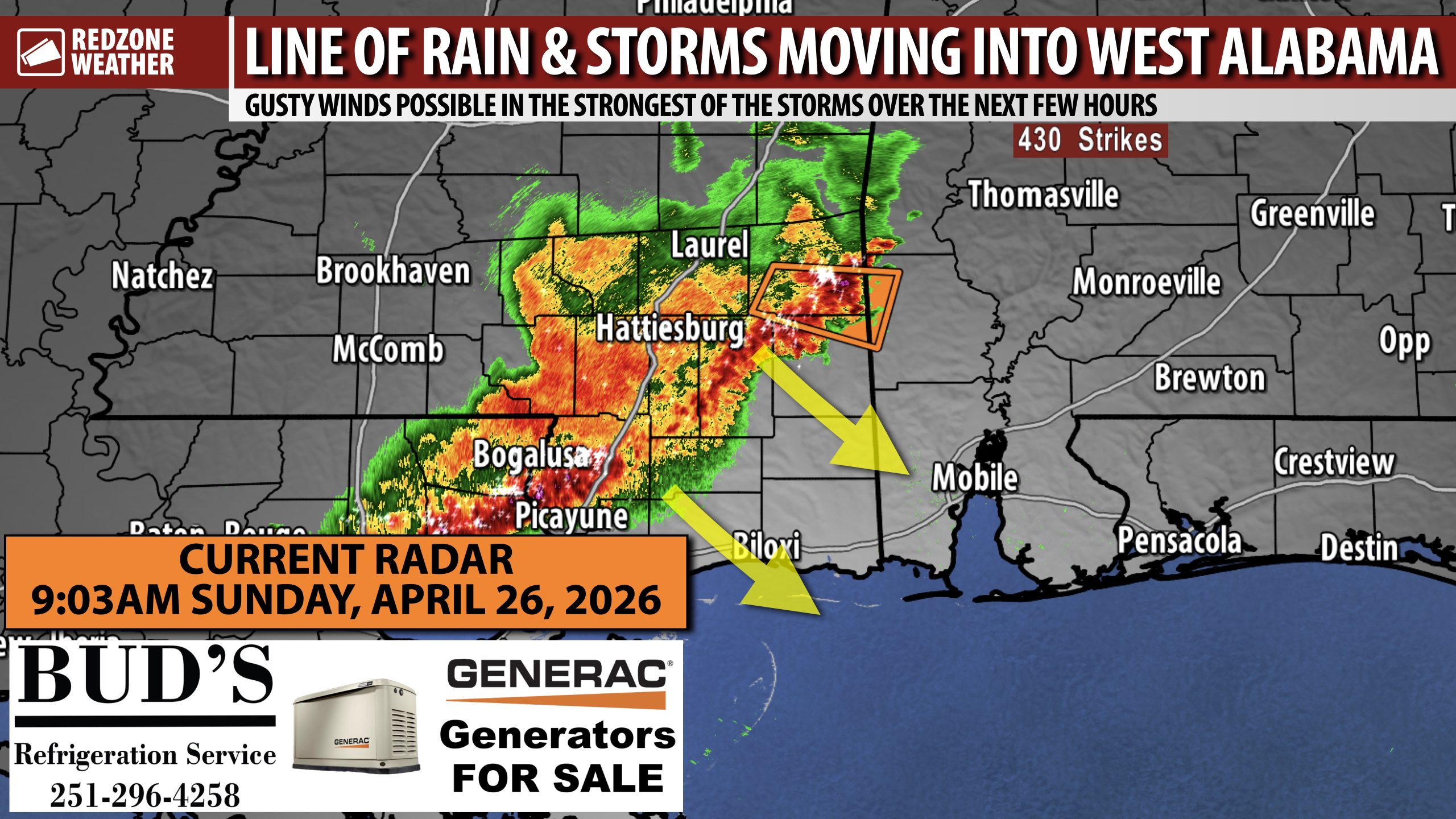 RAIN & STORMS POSSIBLE, PARTICULARLY IN WEST ALABAMA… While this feature likely won’t make it to south-central Alabama or northwest Florida, rain will be possible soon in parts of Choctaw, Washington, Clarke, Mobile, and Baldwin counties as this line of storms continues moving southeast through Noon or so. If we have more in the way of warnings, I will let you know in the RedZone Weather app.