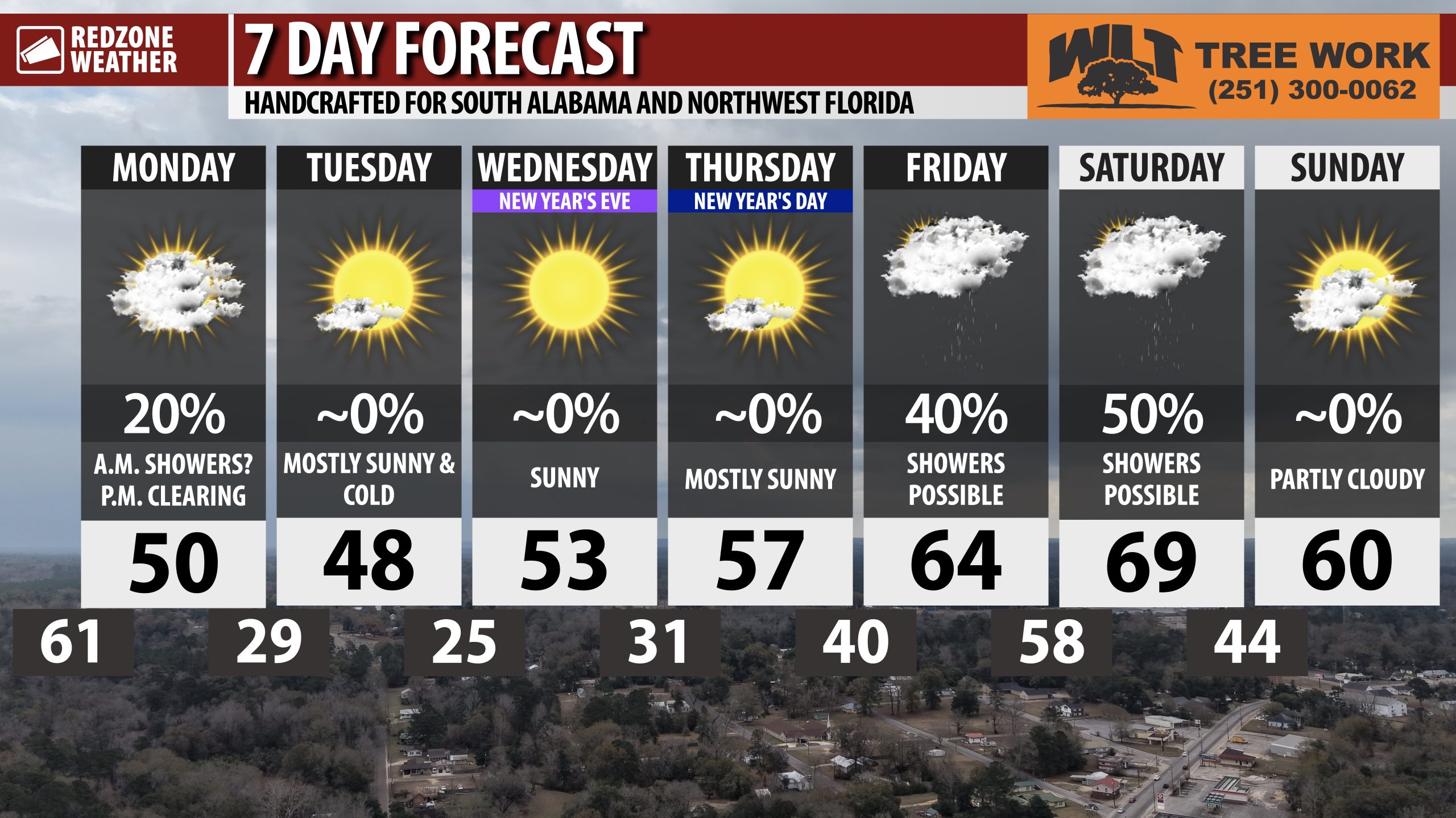 NEW YEAR’S EVE FORECAST… New Year’s Eve across south Alabama and northwest Florida will be dry and cold. Temperatures around 6PM on Wednesday evening will be in the mid 40s. We’ll be in the mid 30s by 10PM and around midnight early Thursday morning as we ring in the Year 2026, temperatures will be around 34Β°. Clouds will increase in coverage on New Year’s Day on Thursday ahead of our next rain chance on Friday.