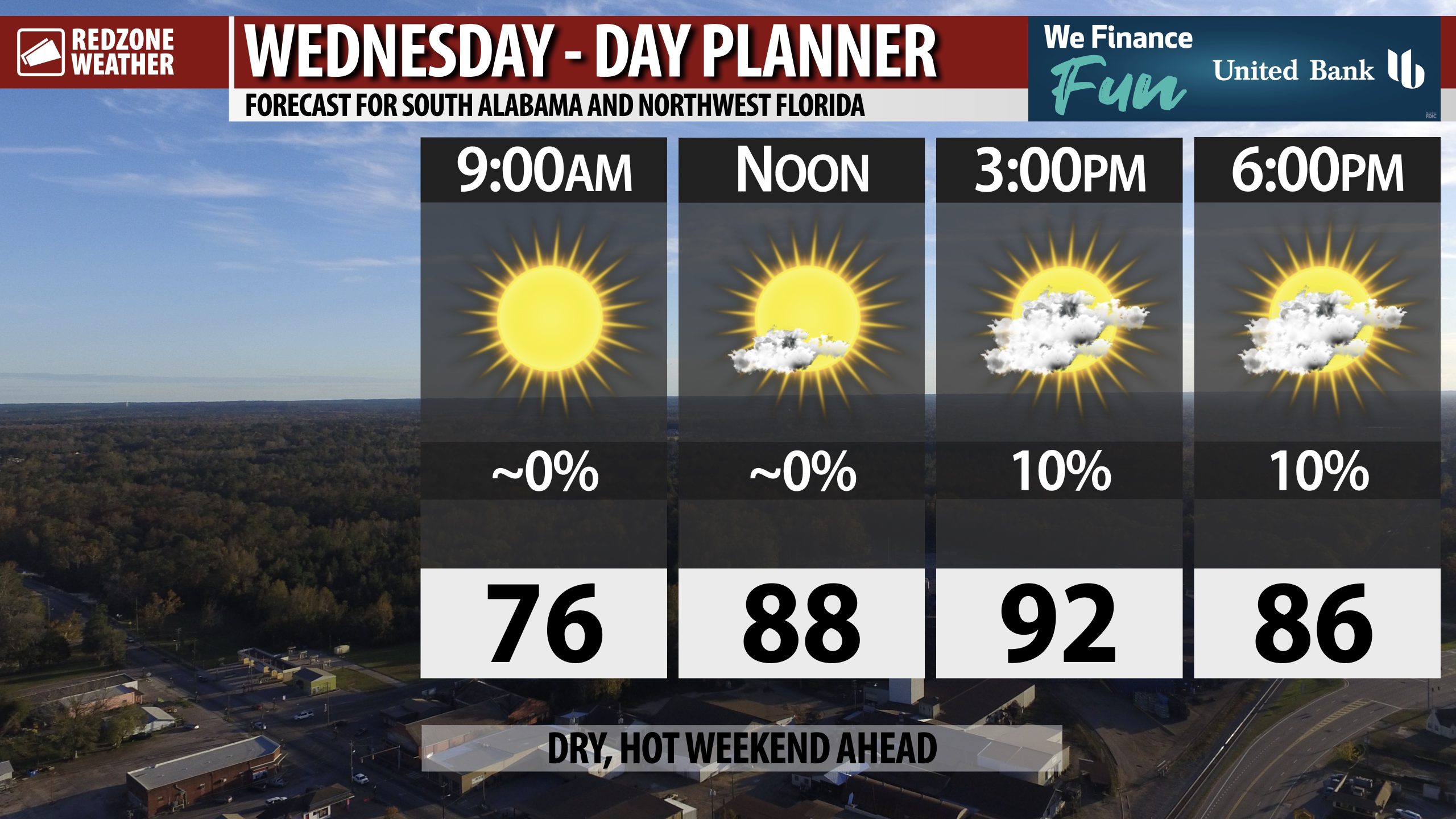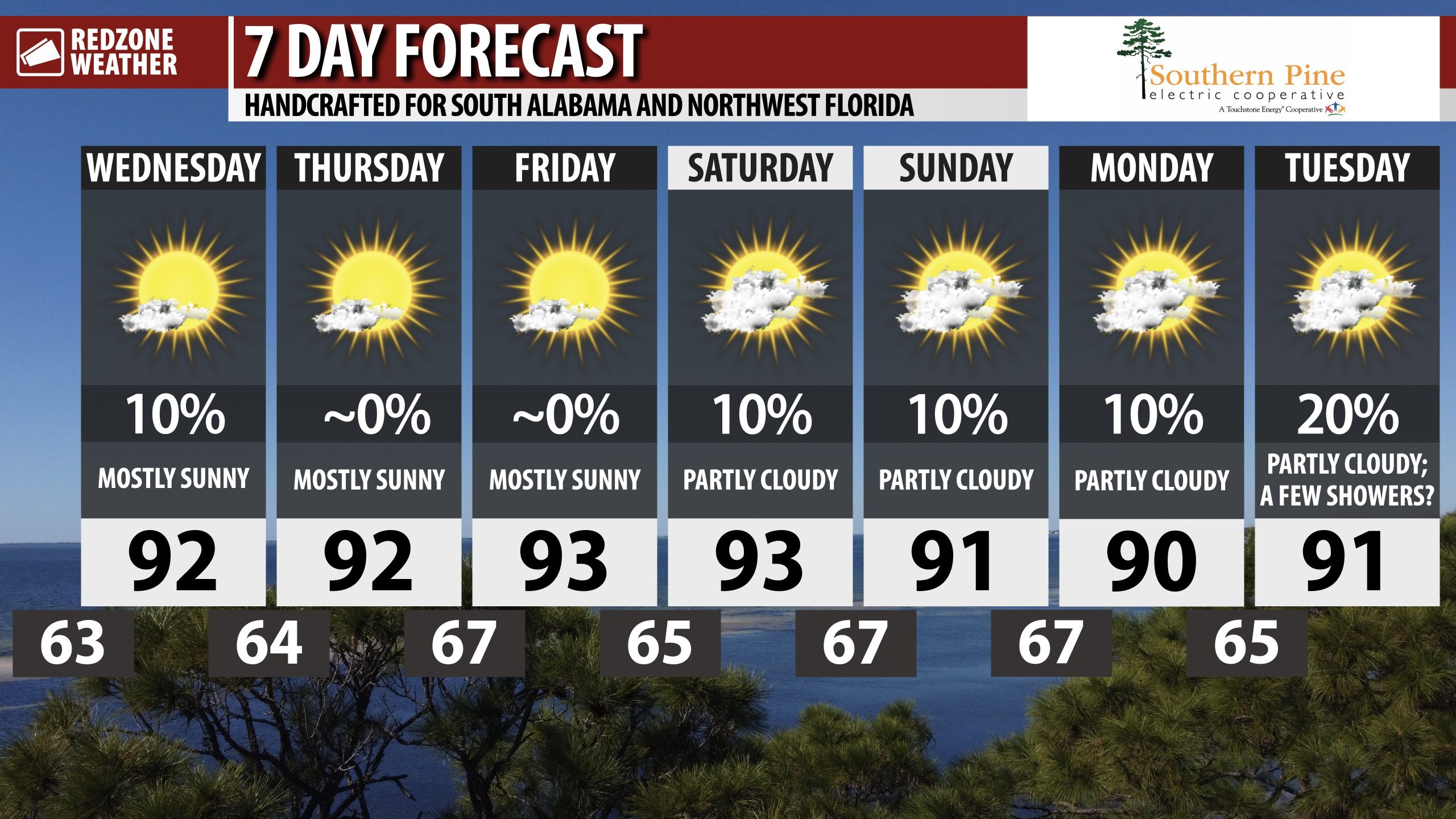 A FEW SPRINKLES INLAND LATER TODAY; SEEING SIGNS OF RAIN BEING POSSIBLE NEXT WEEK… We’re finally beginning to see real evidence in the model guidance that next week could bring some rain and perhaps a few thunderstorms to parts of Alabama and northwest Florida. A lot can and will change between now and then but it’s a sign that the grip of abnormally dry and drought conditions won’t last too much longer. Today, a few sprinkles may happen across interior stretches of south Alabama near the U.S. 84 corridor and points north. Closer to the coast, rain chances are much less. Any sprinkles and showers that happen today won’t amount to much rain, but at this point, any rain is beneficial. Mostly sunny skies are expected this morning with partly cloudy skies this afternoon. High temperatures will be in the low 90s today.