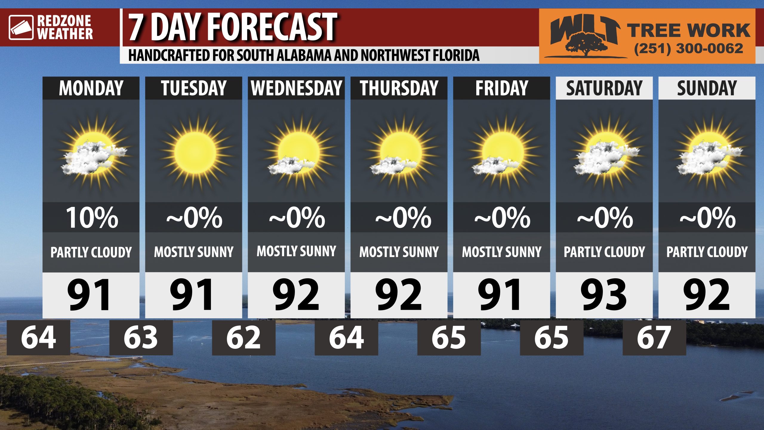 MAINLY DRY, HOT TODAY; DROUGHT CONDITIONS WORSENING… Mostly sunny and hot conditions are expected as we kick off the work week on this Monday. High temperatures will be in the low 90s across the region. Nearly all of us will be dry today across south Alabama and northwest Florida. One or two showers and areas of sprinkles will be possible this evening. Any rain amounts should be rather light. Quite frankly, if you pick up some rain today, count yourself as blessed as most of us across the region won’t get any rain. We have a nice, sunny week on tap, but unfortunately, this means drought conditions across the region are poised to get worse.