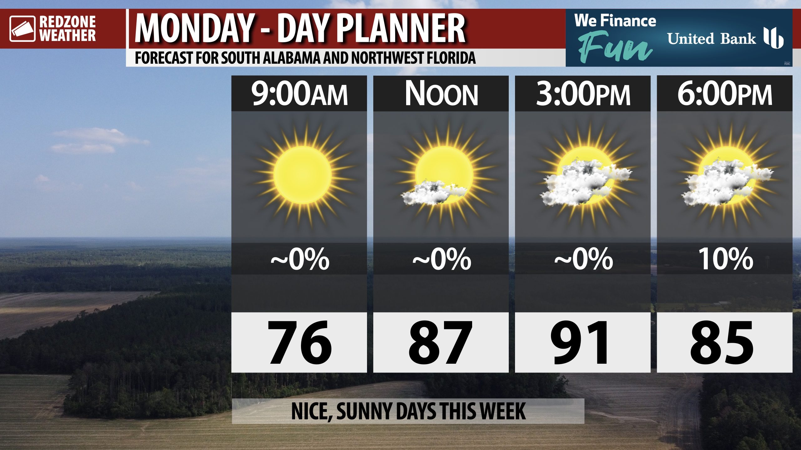 PARTLY CLOUDY THIS AFTERNOON… Nearly all of us across south Alabama and northwest Florida will remain dry on this Monday. A few sprinkles and small showers can’t be ruled out this evening but any rain should be short-lived in nature.