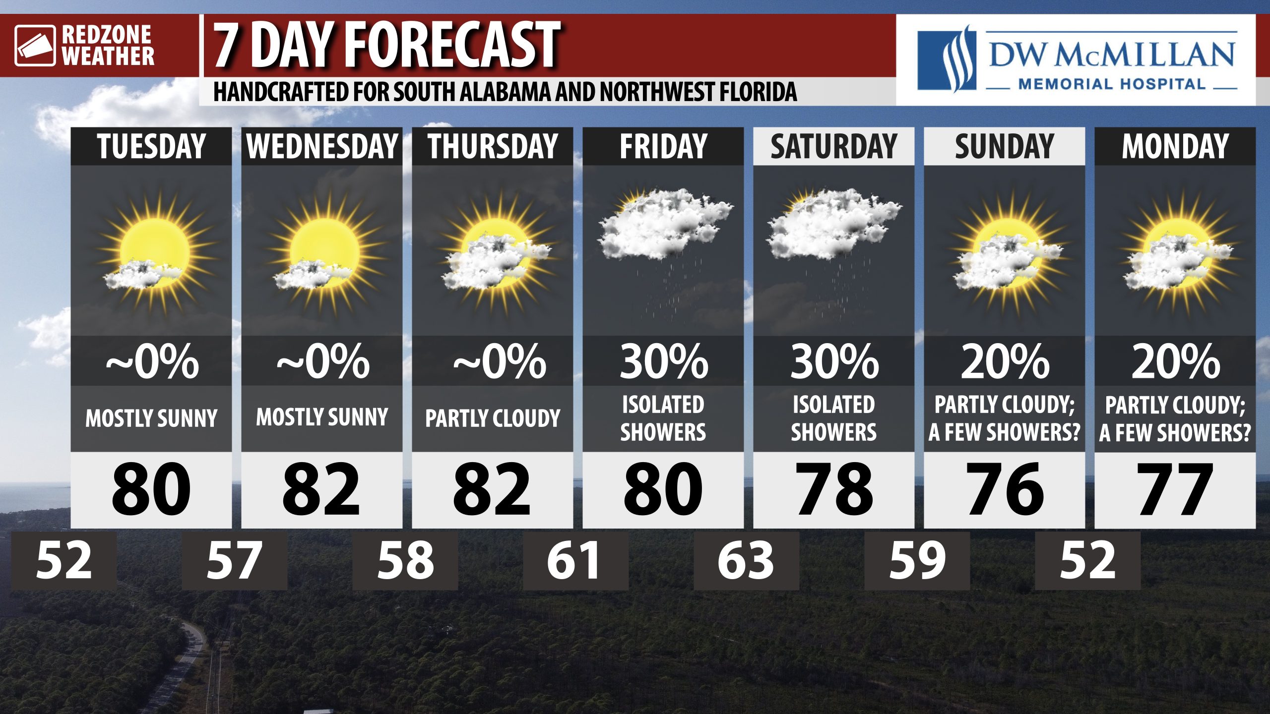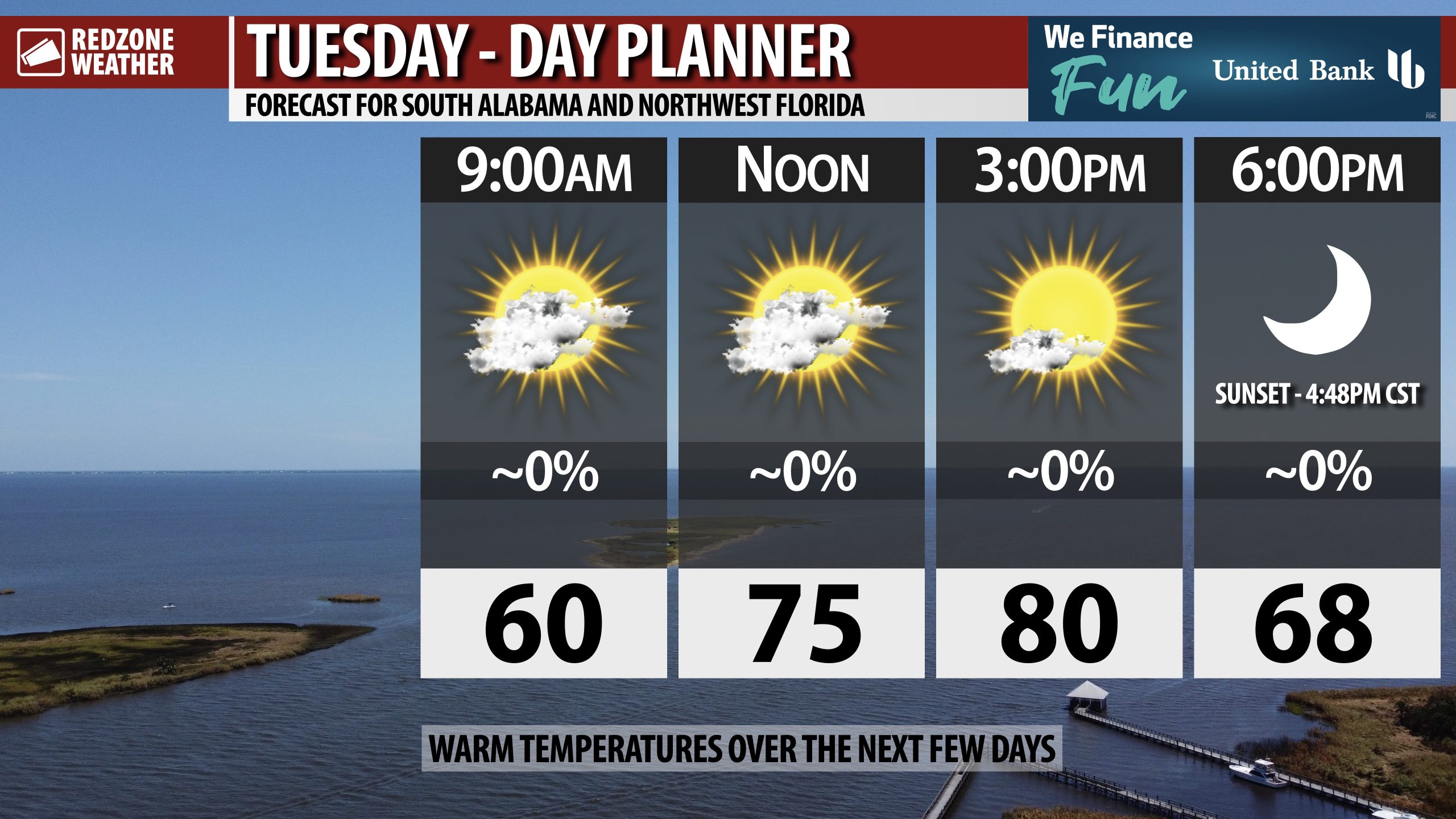 Warm Tuesday across the region! Temperatures are already in the 70s as of late morning. We're headed to a high temperature near 80° across south Alabama and northwest Florida. pic.twitter.com/UOaQegDko6
